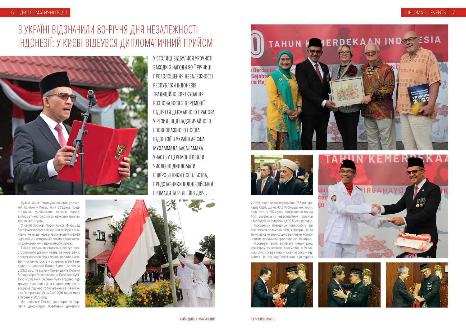 Festive events were held in the capital to mark the 80th anniversary of the proclamation of the independence of the Republic of Indonesia. Traditionally, the celebration began with a flag-raising ceremony at the Residence of the Ambassador Extraordinary and Plenipotentiary of Indonesia to Ukraine, Arief Muhammad Basalamah. The ceremony was attended by numerous diplomats, embassy staff, representatives of the Indonesian community, and religious leaders.