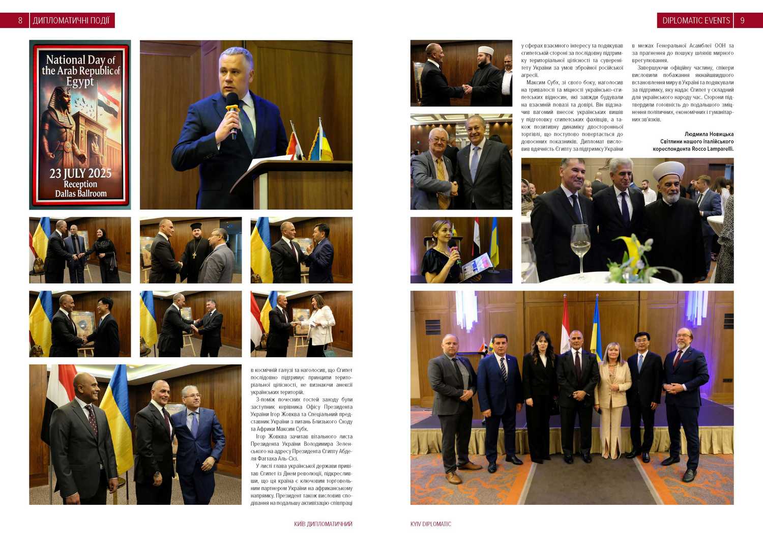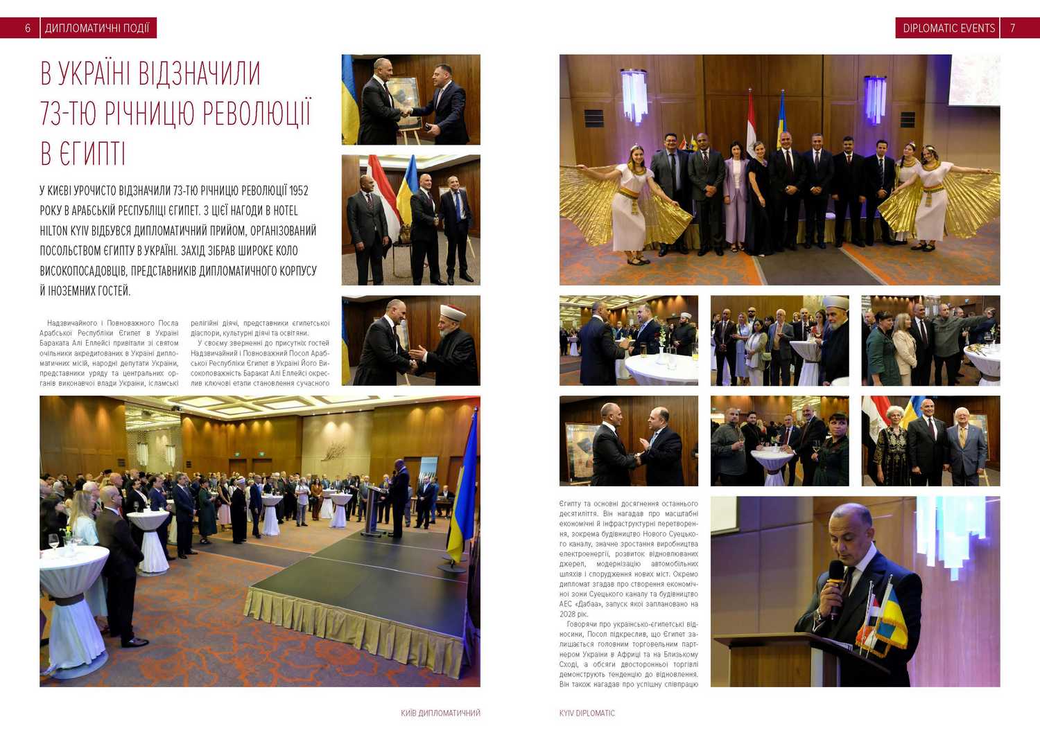У Києві урочисто відзначили 73-тю річницю Революції 1952 року в Арабській Республіці Єгипет. З цієї нагоди в Hotel Hilton Kyiv відбувся дипломатичний прийом, організований Посольством Єгипту в Україні. Захід зібрав широке коло високопосадовців, представників дипломатичного корпусу й іноземних гостей.