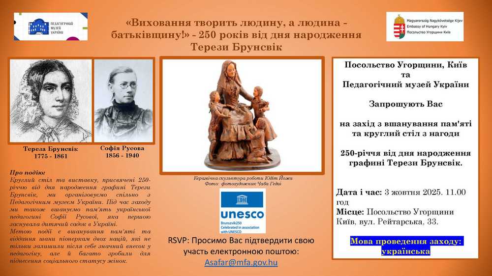 Посольство Угорщини в Україні та Педагогічний музей України провели спільний захід з вшанування пам’яті та круглий стіл з нагоди 250-річчя від дня народження графині Терези Брунсвік. Крім того, під час заходу також вшанували пам'ять української педагогині Софії Русової, яка першою заснувала дитячий садок в Україні.