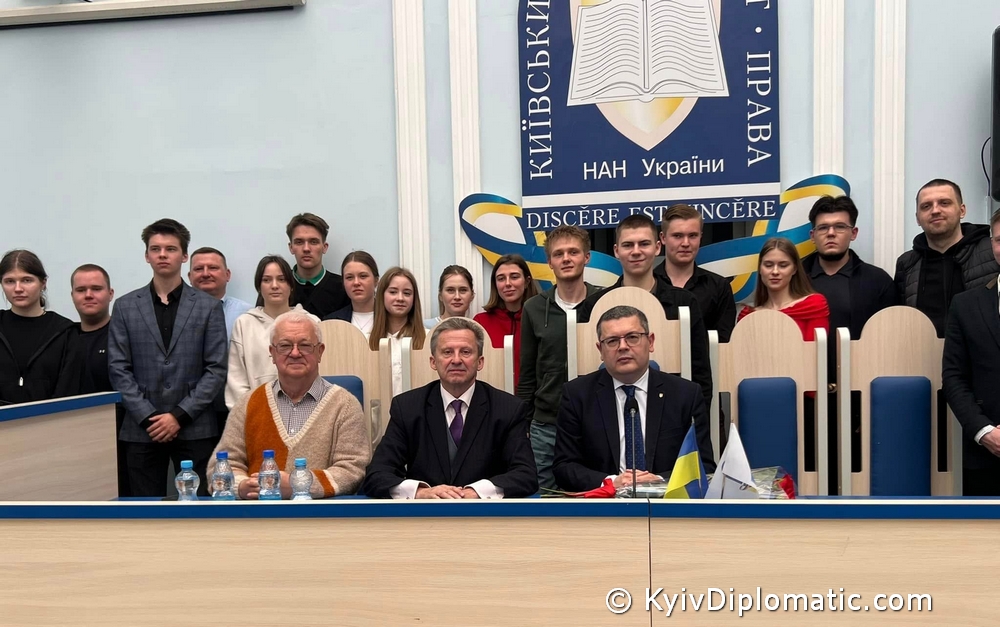 На світлині: народний депутат України, голова Комітету Верховної Ради України з питань зовнішньої політики та міжпарламентського співробітництва, правник, професор, доктор юридичних наук, віцепрезидент ПАРЄ Олександр Мережко, ректор Київського університету права НАН України, Заслужений юрист України, професор, кандидат юридичних наук Юрій Бошицький, засновник та шеф-редактор Часопису «Київ дипломатичний» & Magazine «Kyiv Diplomatic» Олександр Кондратенко і студенти КУП НАНУ.