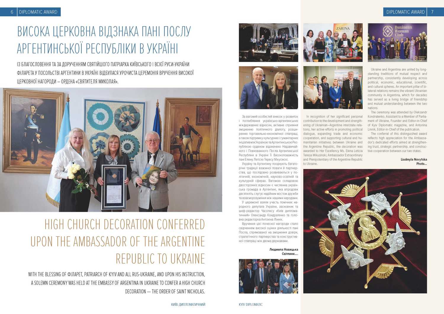 Почесною відзнакою було нагороджено пані Посла Елену Летісію Мікусінскі на знак визнання її вагомого внеску у розвиток українсько-аргентинських відносин, підтримку гуманітарних та культурних ініціатив, а також сприяння міжкультурному та міжрелігійному діалогу.