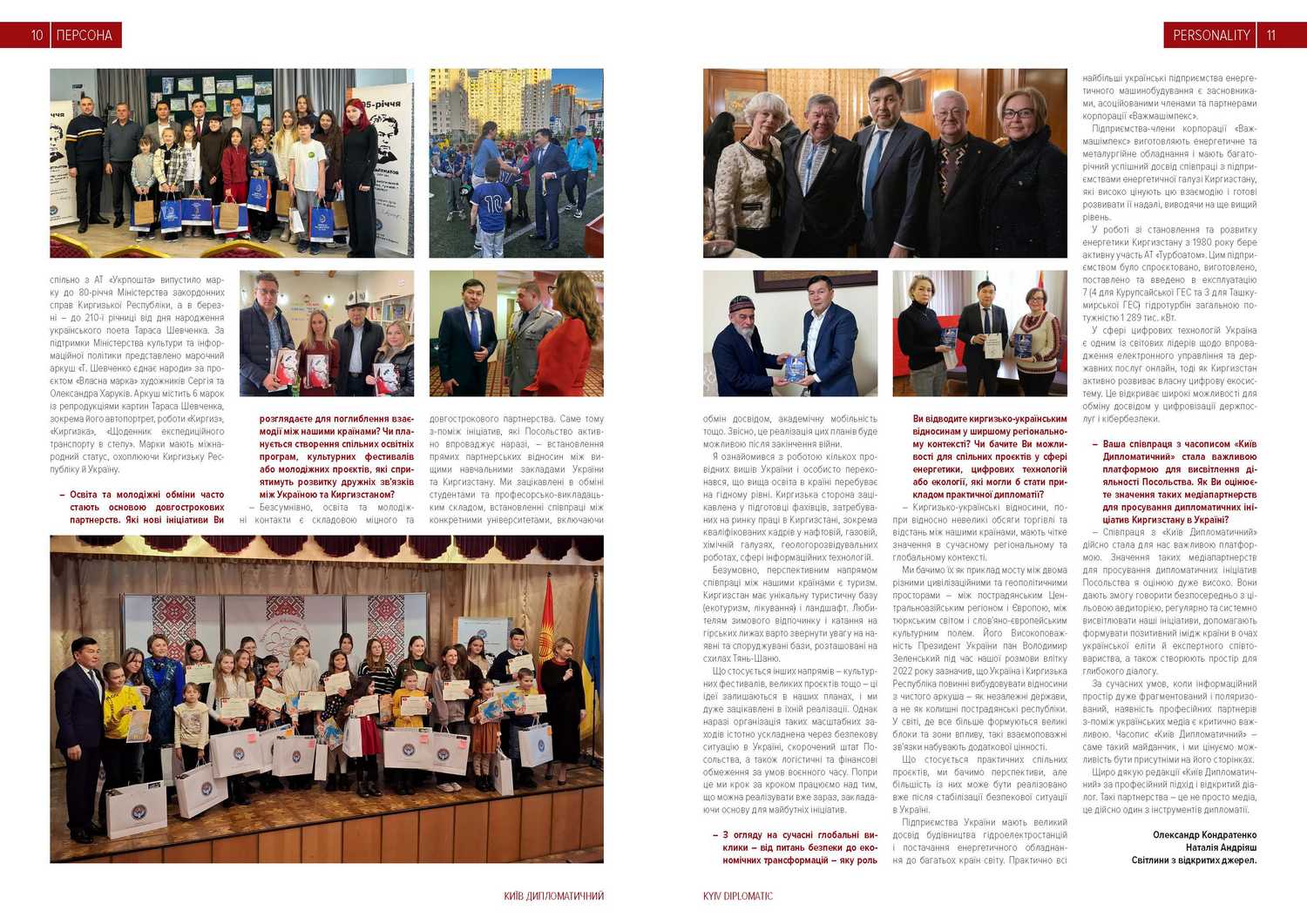Уже понад чотири роки киргизька дипломатична місія працює в Україні, долаючи виклики війни та водночас вибудовуючи нові горизонти співпраці. Під час розмови Надзвичайний і Повноважний Посол Киргизької Республіки в Україні пан Ідріс Кадиркулов окреслив ключові напрями двостороннього партнерства – від міжуніверситетських програм і молодіжних обмінів до спільних проєктів у сфері енергетики та цифрових технологій. Попри труднощі війни, дипломат наголошує: культурна дипломатія, освітні ініціативи та медіапартнерства залишаються міцними мостами, що формують довгострокову довіру та дружбу між українським і киргизьким народами.