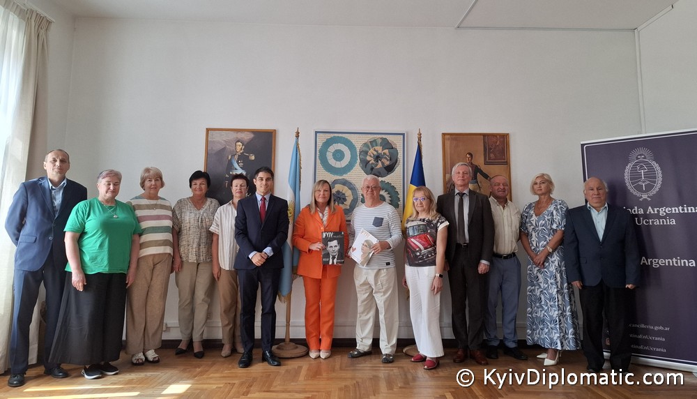 На світлині: Всі співробітники Посольства Аргентинської Республіки в Україні началі з Надзвичайним і Повноважним Послом Аргентинської Республіки в Україні Еленою Летісію Тересою Мікусінскі та секретарем Посольства Хорхе Мартіном Куарантою і помічник народного депутата України, шеф-редактор Часопису "Київ дипломатичний" & Magazine "Kyiv diplomatic" Олександр Кондратенко.