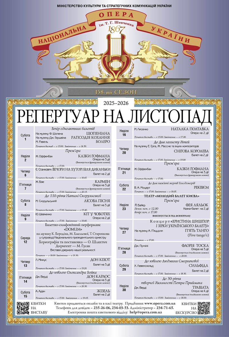 Афіша завершального місяця осені в Національній опері України виглядає так: